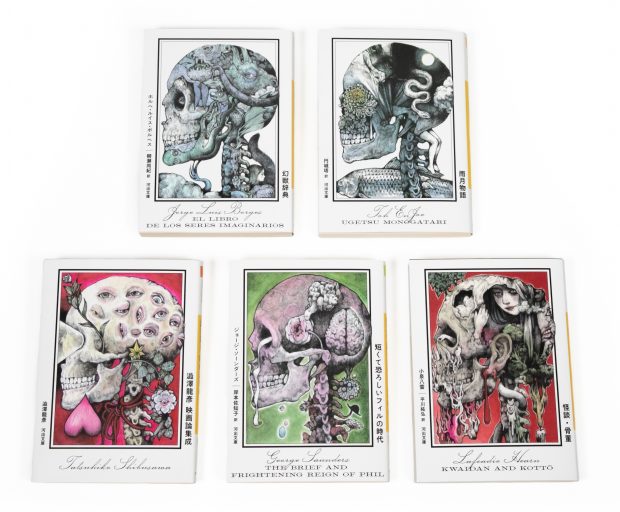 三つ編みの少女とその肩に乗るフクロウが描かれたメインビジュアルをはじめ、河出文庫を象徴する「フクロウ」のアイコン、また、「ヒグチユウコが選ぶ河出文庫ベスト・オブ・ベスト」5タイトルの限定カバー(全面帯)にあしらわれた「どくろ(スカル)」の装画は、すべて当フェアのためのヒグチユウコさん描き下ろし作品。
