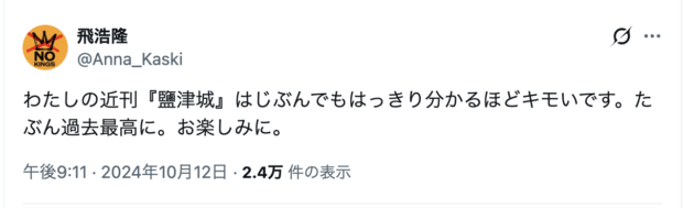 24年刊行時、飛さんはXで次のようなメッセージを投稿しています。